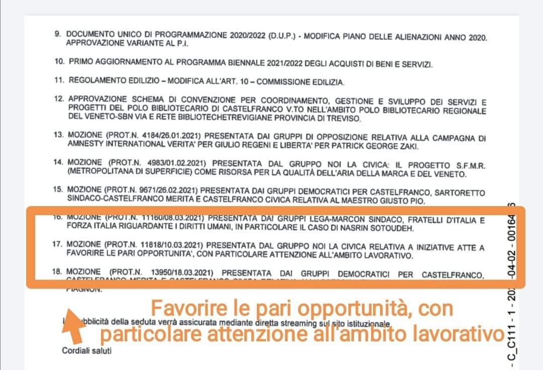 Non torniamo, poi, sugli emendamenti alla delibera su istituzione e disciplina della Commissione Pari Opportunità: la maggioranza, compatta, non ha voluto garantire un budget a questa commissione comunale né stabilire che alle proposte della stessa sia data una risposta entro un certo numero di giorni. Di fatto si vuole privarla del suo potenziale prima ancora di effettuare le nomine.