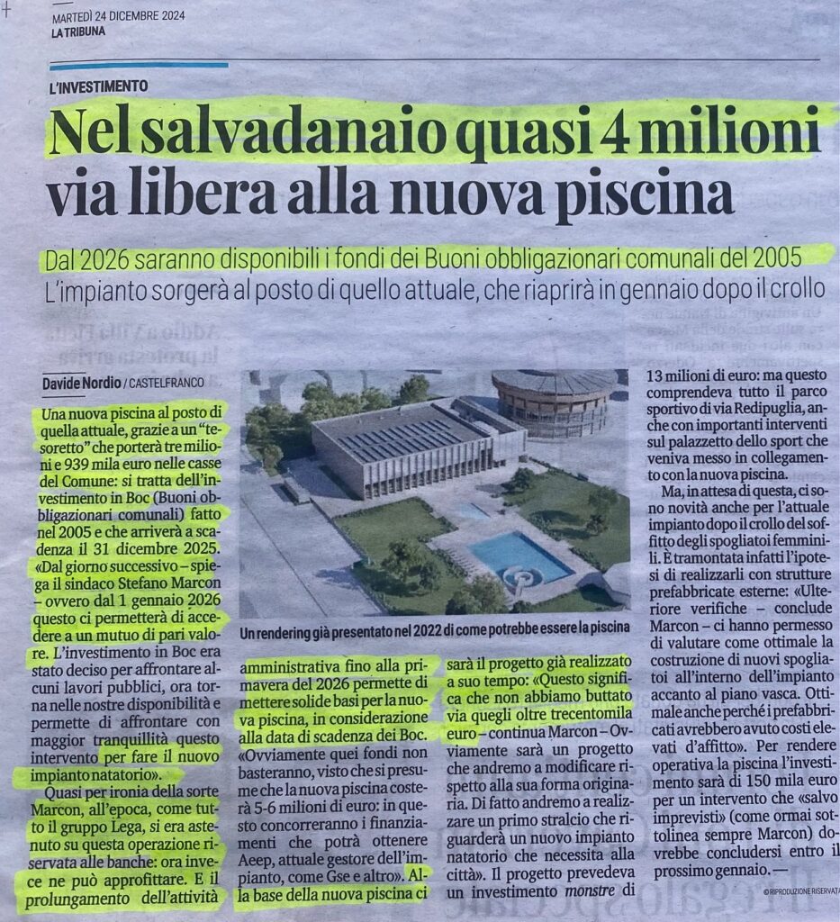In Consiglio Comunale avevamo deliberato infatti l’istituzione di B.O.C., Buoni Obbligazionari Comunali, utili a finanziare Lavori Pubblici: e ora, alla scadenza ventennale, potrà essere acceso un mutuo di pari valore. Per fare quale opera pubblica? La nuova piscina comunale, ha dichiarato Marcon, che avrà come base il progetto faraonico – costato 300.000,00 euro – di tre anni fa e che prevede un fabbricato da zona industriale in pieno centro cittadino. Beneficiando di una operazione, promossa dal Settore Economico-Finanziario, che allora la Lega con le altre minoranze aveva contestato ma che ora le capita a fagiolo: perché così il Sindaco attuale può evitare l’accusa di danno erariale per aver speso 300.000,00 euro per un progetto sepolto in un cassetto.