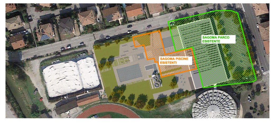 Ma non si sa quali soluzioni abbiano immaginato: quello che sappiamo è che pende sul centro città un capannone enorme, a due passi dalle Mura medioevali. Con un cantiere destinato a durare anni fra demolizioni, bonifiche, parcheggi, riorganizzazione di tutta la viabilità, accessi, modifiche del Palazzetto, accordi con i proprietari del resto del comparto. Ed eliminazione-spostamento del parco pubblico. (In foto, la parte di area verde occupata dal volume della piscina).