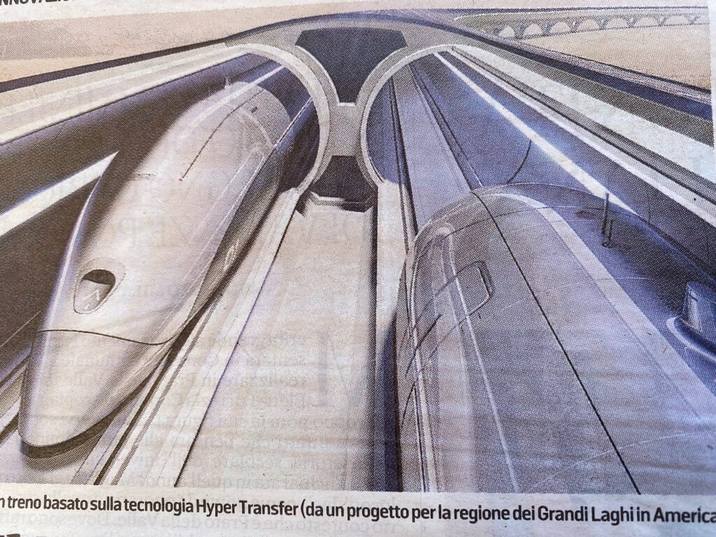 Parliamo dei programmi che la Regione squaderna con interviste e conferenze stampa legate ai trasporti, giocando di sponda con il Pnrr. Veniamo così a sapere che il Veneto sarà il primo territorio in ambito europeo nel quale si sperimenteranno i treni a levitazione. La Regione ha firmato il 30 dicembre un accordo con C.A.V., Concessioni Autostradali Venete, e ANAS – quindi società pubbliche che usano soldi pubblici, i nostri – per uno studio di fattibilità propedeutico alla realizzazione di un treno capace di viaggiare a oltre 1000 km/ora muovendosi dentro a un doppio tubo sopraelevato. Praticamente in un’ora poco più possiamo andare da Venezia a Reggio Calabria.